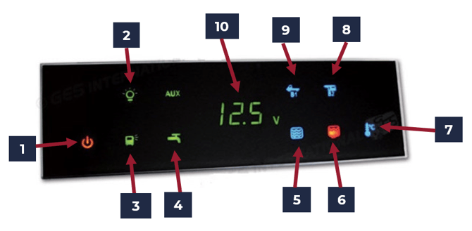 Utilisez ce bouton pour activer ou désactiver la pompe à eau, indispensable pour la douche, les éviers et la chasse d’eau des toilettes. Une lumière verte confirme qu’elle est activée. -